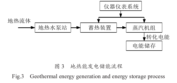 蒸汽機組是利用地熱流體中的熱能來驅動渦輪機發(fā)電的關鍵設備。高溫蒸汽通過管道輸送到蒸汽機組,推動渦輪葉片旋轉,從而帶動發(fā)電機產(chǎn)生電力。蒸汽機組的效率和性能直接影響地熱能發(fā)電系統(tǒng)的整體效益。為了提高發(fā)電效率, 現(xiàn)代蒸汽機組通常采用高效的熱交換技術和先進的材料,以減少熱能損失和設備磨損。電池儲能裝置在地熱能發(fā)電中的應用主要是為了平滑電力輸出,提升電網(wǎng)穩(wěn)定性。地熱能發(fā)電具有一定的間歇性和波動性,電池儲能系統(tǒng)可以在電力輸出不足時迅速補充電力,同時在電力過剩時存儲電能,以備后用。常見的電池儲能技術包括鋰離子電池、鈉硫電池和全釩液流電池等。這些電池系統(tǒng)不僅具有快速響應能力,還能在一定程度上延長地熱能發(fā)電設備的使用壽命。地熱能發(fā)電儲能流程如圖3所示。