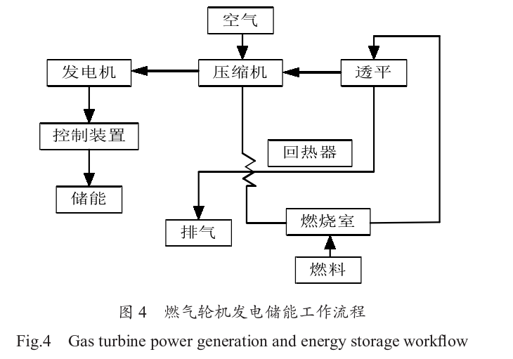 燃氣輪機發(fā)電儲能是通過燃料供給系統(tǒng)將天然氣輸送到燃燒室。天然氣在燃燒室內(nèi)與空氣混合燃燒,產(chǎn)生高溫高壓的燃氣。這些高溫高壓的燃氣迅速膨脹,并流經(jīng)透平葉片, 推動透平旋轉。透平葉片通過軸連接到發(fā)電機,透平的旋轉帶動發(fā)電機的轉子旋轉,從而在定子中產(chǎn)生電流,完成電能的轉換。最終將電能儲存到儲能系統(tǒng)中,以便在電力需求高峰期或電網(wǎng)出現(xiàn)故障時進行釋放和使用。如圖4所示。在燃氣輪機發(fā)電儲能過程中,儲能系統(tǒng)可以幫助平衡燃氣輪機發(fā)電的輸出波動。燃氣輪機的啟動和停止時間較長,且燃料燃燒效率和發(fā)電效率容易受環(huán)境溫度和負荷變化的影響。通過儲能系統(tǒng)的調節(jié),可以在短時間內(nèi)補償輸出功率的波動,確保電網(wǎng)的穩(wěn)定運行。在負荷較低時,燃氣輪機的效率較低, 部分燃料會被浪費。儲能系統(tǒng)可以在這種情況下存儲多余的電能,并在電力需求高峰期釋放,減少燃氣輪機的啟動和停止次數(shù),從而提高整體的能源利用效率。