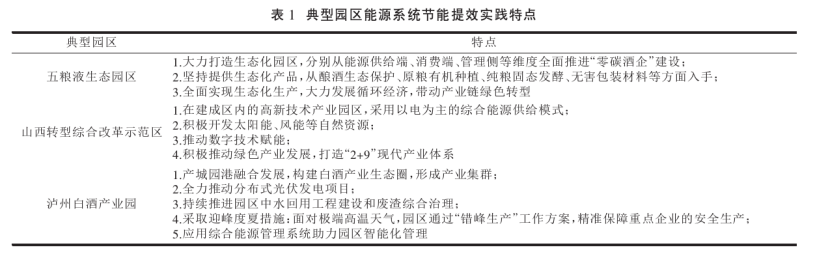 園區(qū)在推動(dòng)我國實(shí)體經(jīng)濟(jì)發(fā)展和城鎮(zhèn)化發(fā)展中發(fā)揮了關(guān)鍵作用,是支撐制造強(qiáng)國戰(zhàn)略的主戰(zhàn)場。有研究表明,園區(qū)二氧化碳排放量約占全國總排放量的31%[4],園區(qū)是資源能源消耗最集中的地方?,F(xiàn)階段,為了節(jié)約能源,保護(hù)環(huán)境,我國各級園區(qū)都在持續(xù)推動(dòng)綠色低碳發(fā)展。田金平等研究指出我國工業(yè)園區(qū)節(jié)能提效實(shí)踐創(chuàng)新主要體現(xiàn)在以下5個(gè)方面: ①聚焦重點(diǎn)領(lǐng)域,全過程系統(tǒng)性推進(jìn)節(jié)能工作。②集中式能源基礎(chǔ)設(shè)施升級改造,多樣化開發(fā)利用余熱、 余壓和能量多級利用。③積極利用可再生能源,推進(jìn)能源結(jié)構(gòu)轉(zhuǎn)型升級。④積極開展智慧能源探索,實(shí)現(xiàn)能源全過程精細(xì)化管理。⑤建立健全能源管理體系。表1為典型園區(qū)能源系統(tǒng)節(jié)能提效實(shí)踐特點(diǎn)。