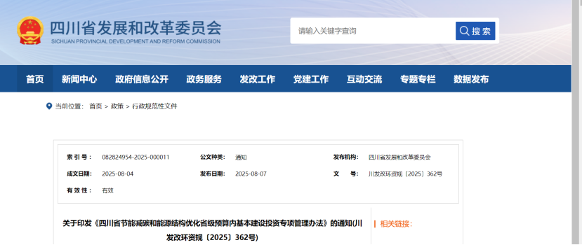 8月7日,四川省發(fā)展和改革委員會(huì)發(fā)布關(guān)于印發(fā)《四川省節(jié)能減碳和能源結(jié)構(gòu)優(yōu)化省級預(yù)算內(nèi)基本建設(shè)投資專項(xiàng)管理辦法》的通知(川發(fā)改環(huán)資規(guī)〔2025〕362號(hào))。