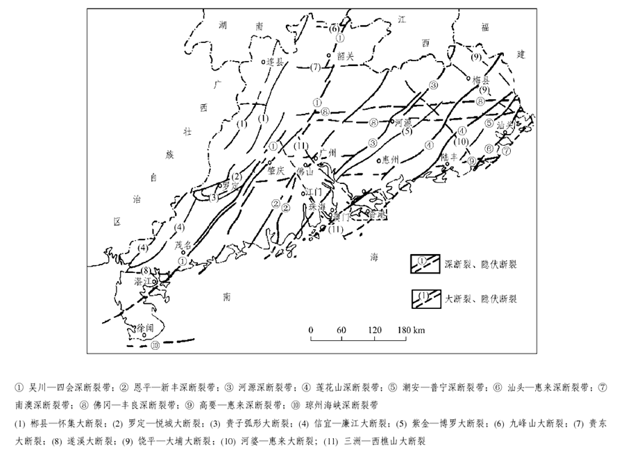 廣東省在大地構造上屬華南褶皺系的一部分,其演化過程經(jīng)歷了三個發(fā)展階段及相應的構造旋回和構造運動:加里東運動形成緊密線型褶皺,主要呈NEE方向,成為廣東省構造骨架的基礎;印支運動形成多方向的過渡型蓋層褶皺;燕山運動以斷塊造山、NE向和EW向深大斷裂控制的火山噴發(fā)、巖漿侵入為主。深大斷裂對廣東省的沉積建造、巖漿活動、變質作用和成礦作用有較明顯的控制。主要的深斷裂有吳川-四會、恩平-新豐、河源、蓮花山、潮安-普寧、汕頭-惠來、南澳、佛岡-豐良、高要-惠來、瓊州海峽等,主要的大斷裂有郴縣-懷集、羅定-悅城、貴子、信宜-廉江、紫金-博羅、九峰山、貴東、遂溪、饒平-大埔、河婆-惠來、三洲-西樵山等。這些深大斷裂都具有規(guī)模大、活動時間長等特點。從總體上看。廣東省境內大型褶皺和深大斷裂以NE向為主,間夾EW向和NW向構造組成復雜的構造圖景。