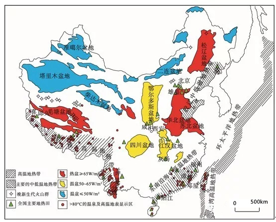 中國(guó)東部,高地溫梯度異常區(qū)多分布于松遼盆地、華北盆地及東南沿海地區(qū),地溫梯度多在4-5.°C/100m,最高可達(dá)7-8°C/ 100m,其分布多呈條帶狀,北東向延伸同地溫分布規(guī)律一致。