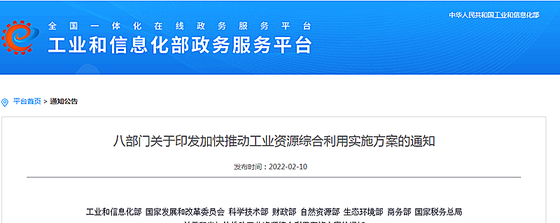 地大熱能地?zé)?多能互補(bǔ)網(wǎng)訊:2月10日,工業(yè)和信息化部、國(guó)家發(fā)展和改革委員會(huì)、科學(xué)技術(shù)部、財(cái)政部、自然資源部、生態(tài)環(huán)境部、商務(wù)部、國(guó)家稅務(wù)總局等八部門(mén)聯(lián)合印發(fā)了《關(guān)于印發(fā)加快推動(dòng)工業(yè)資源綜合利用實(shí)施方案的通知》(下文簡(jiǎn)稱(chēng)《通知》)。