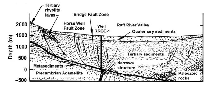 拉夫特河地熱田的熱儲層,處在一個盆地中,這個盆地西部以一個小角度的斷層為界限,東邊則是由黑松山(Black Pine Mountains)和一個二次斷層分界。熱儲的蓋層為第三系的沉積層,基底巖石大約厚度為1600m,在這個深度被一個東北向的線性構(gòu)造—解理構(gòu)造(Narrows Structure)所貫穿,人們認為這個結(jié)構(gòu)是基底剪切作用產(chǎn)生的。熱源為前寒武紀二長花崗巖。開始,人們認為熱液是通解理構(gòu)造涌上來,然后通過其他的褶皺和斷層蔓延整個沉積構(gòu)造?,F(xiàn)在的人們則認為有兩個熱源補給區(qū),一個來自西北方向沿著馬井斷層分布的補給區(qū),另外一個則是來自東南方向的,可能是與變窄構(gòu)造有關(guān)聯(lián)。