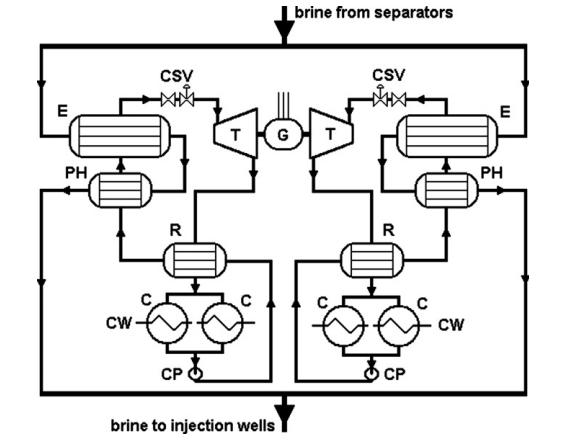 米拉瓦列斯的五號發(fā)電機組是2004年剛投入使用的。這個發(fā)電機利用從一號和二號和三號發(fā)電機組中的廢棄鹵水,通過注入井來獲取了可能回到熱儲層中的能量。總共的發(fā)電量是15.5MW,發(fā)電機組中的每一個發(fā)電單元都發(fā)出7.75MW的電。每一個發(fā)電單元是有兩個渦輪組成的,驅(qū)動同一個發(fā)電機。循環(huán)工質(zhì)是常規(guī)的正戊烷,C5H12。每一個單元用兩個預(yù)熱器。兩個蒸發(fā)器跟他們各自的分隔板。兩個回?zé)崞?,四個水冷凝器。這個發(fā)電機組是有澳瑪特(Ormat)提供的。