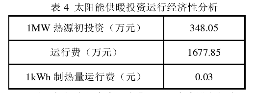 根據(jù)《太陽能供熱供暖工程技術(shù)規(guī)范》 (GB50495-2019),在寒冷地區(qū)太陽能供暖系統(tǒng)須采用間接供暖系統(tǒng)。太陽能間接供暖系統(tǒng)用于集中供暖熱源投資運(yùn)行經(jīng)濟(jì)性分析詳見表4:
