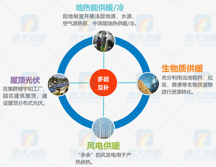 地熱+(風能、太陽能、氫能、儲能、水能、生物質能等)新能源,根據(jù)因地制宜、多能互補實現(xiàn)能源綜合開發(fā)利用。